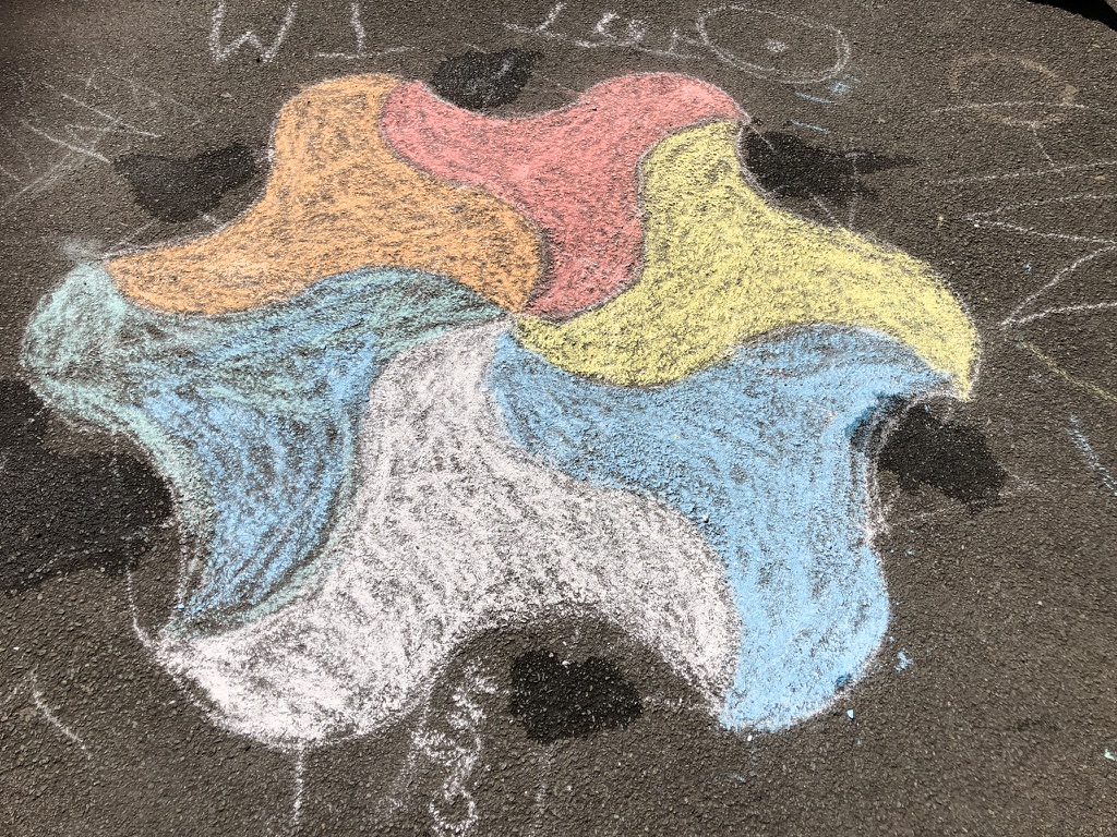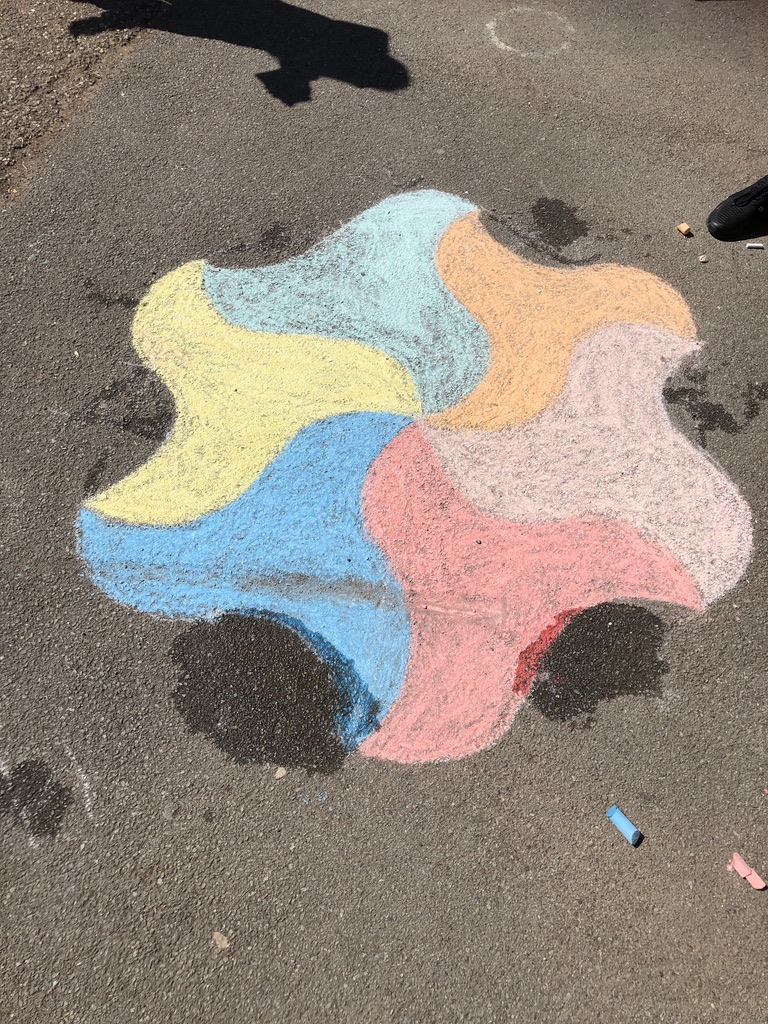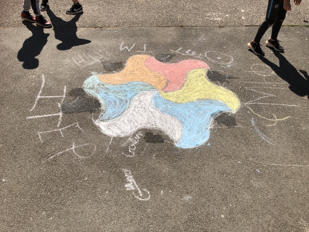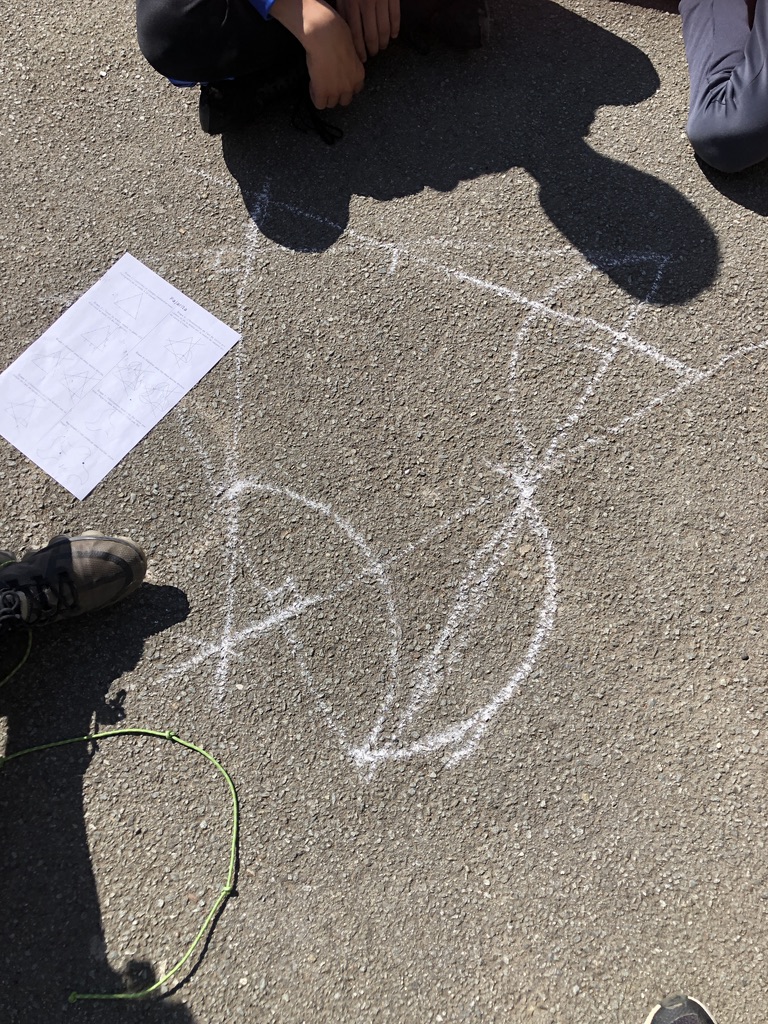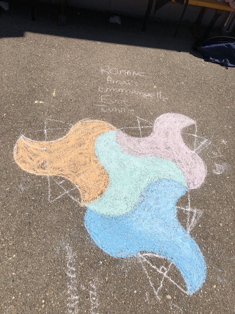 Il y a eu deux temps de construction : une première réalisation dans la salle de classe sûre de la nappe pour découvrir le tracé puis dans la cour où ils ont pu faire ces splendides réalisations :
